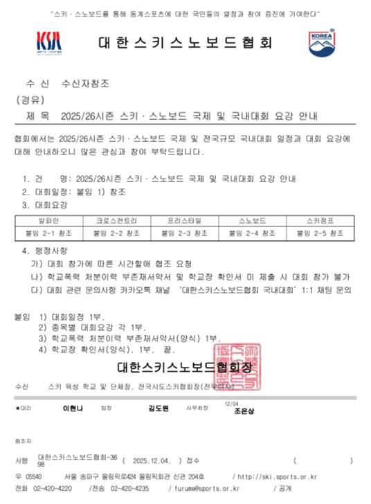 0. (공문) 2025-26시즌 스키·스노보드 국제 및 국내대회 요강 안내.hwp (144.0 KB)