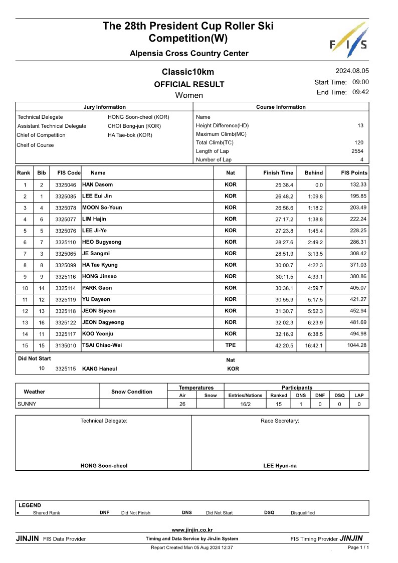 제28회 회장배 전국롤러스키대회 및 FIS Summer Race(클래식 국제 여자 공식결과)